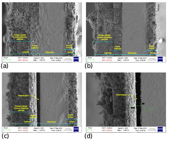 Cross sectional SEM images of the cells after long-term testing at 900 C. (a) Shows the cell in its initial state. (b) shows the cell that has been operated for 850 h without salt contamination. (c) shows the cell after operation with salt contamination (at 1 ppm) for 660 h, the cell can be seen to have delaminated leading to severe and irreversible degradation. (d) shows a detail of the delamination.