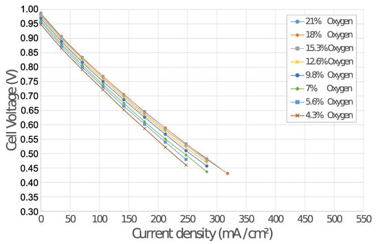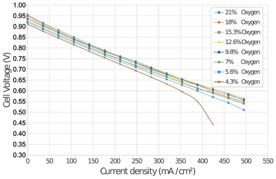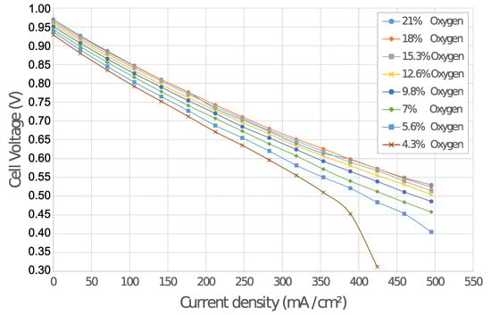 - The effect of decreasing oxygen partial pressure is more significant when the oxygen concentration is decreased below 12.6%. The fall in cell voltage at higher current densities and very low oxygen concentration indicates the development of concentration polarisation.