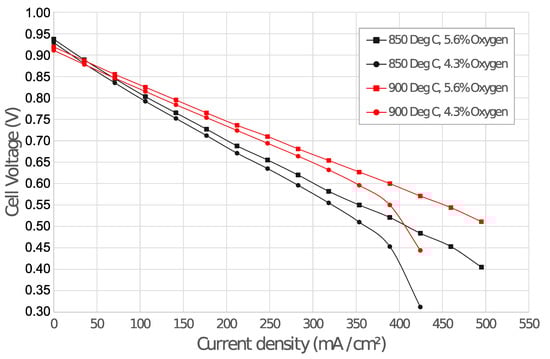 The performance of the cell operating at 900 C with decreasing partial pressure of oxygen—At 900 C, the performance of the cell is better than that of the cells operated at 800 C and 850 C. But its performance decreases for very low partial pressure of oxygen, smaller than 5.6% oxygen.