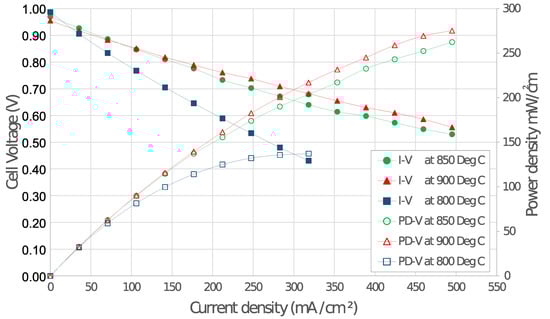 Figure 15 gives information about the cell performance at the three different temperatures and shows voltage-current density and power-current density characteristics, from which it can be seen that at 900 C the cell has the higher power density of 280 mW/cm. This is consistent with the literature [21,22].