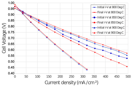 Voltage-current density comparison of the cell at different temperatures before and after the testing program—At 800 C, 850 C and at 900 C.