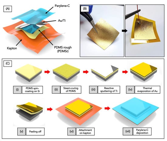 The metal electrodes of the devices were made by metallizing the PDMS substrate by physical vapor deposition processes: titanium (50 nm) was first deposited as adhesion promoter (Figure 1C(iii)) by reactive sputtering and then gold (50 nm) was thermally evaporated as exposed electrode (Figure 1C(iv]). After peeling off the flexible patch (Figure 1C(v)), it was attached onto a 25 µm-thick kapton foil and used as support for the connections (Figure 1C(vi)): an electrical wire was connected using a rivet and a ~2.5 µm-thick parylene C film was then deposited by room temperature chemical vapor deposition (RT-CVD) step (Figure 1C(vii)).