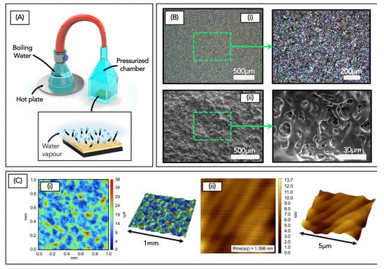 The topography images (see Figure 2C(i)), taken with the profilometer, provide information about the height of asperities produced by the water vapor on scanned areas of 1 × 1 mm2: a maximum roughness of 30–40 µm was measured, as shown by the colored bar. A lower-range morphology, at the inner surface of the pores, was observed with AFM, as reported by the micrographs in Figure 2C(ii): the roughness (Rms(sq)) of a scanned area of 5 × 5 µm2 was 1.398 nm.
