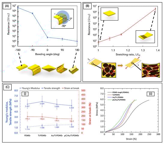 (A) Measurement of electrical resistance of the metallized PDMS patch as a function of the bending angle. (B) Measurement of electrical resistance of the metallized PDMS patch as a function of the stretching ratio; the insets show the conductive pathways inside the porous morphology of the patch. (C) Dynamic mechanical analysis (DMA) of the PDMS rough patch with the overlying layers. (i) Summary plot of the Young’s modulus, tensile strength, and strain at break of neat rough PDMS (PDMSr) and covered with Ti, Au/Ti, and pC/Au/Ti. (ii) Stress–strain curves obtained after the tensile tests of the same samples.