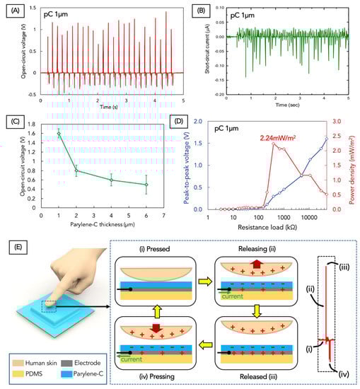 Open-circuit voltage (A) and short-circuit current (B) generated by the proposed triboelectric nanogenerator (TENG) with the triboelectric parylene C layer of 1 µm, under finger tapping of ~2N at ~5Hz. (C) Open-circuit voltage as a function of the parylene C thickness. (D) Peak-to-peak voltage and power density generated by the TENG with parylene C thickness of 1 µm as a function of the resistive load. (E) Proposed working principle for the TENG under finger tapping: the steps of the press–release cycle are illustrated and indicated for the inset of the output voltage signal.