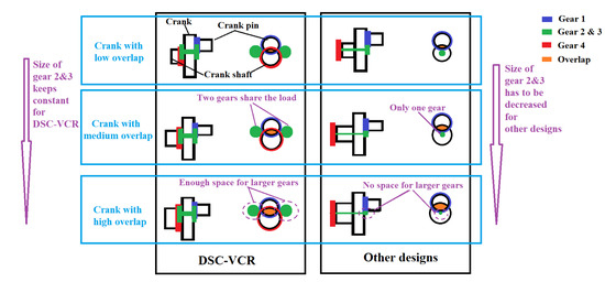Comparison of gear position for the DSC-VCR and other designs in different crank overlap engines [24].