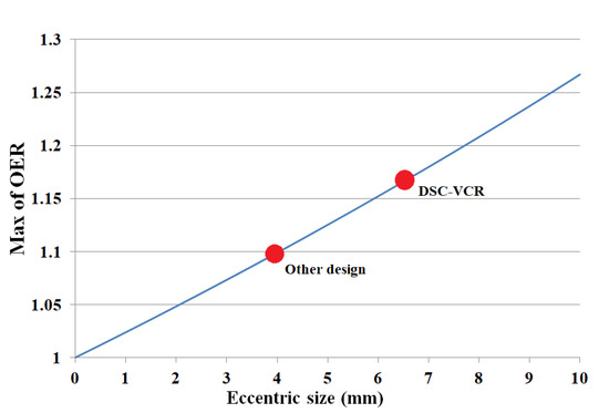 A larger eccentric size is helpful to improve thermal efficiency. The load of the transmission gear is the key limit to the increase of eccentric size. In Section 1, three methods of engines realizing VCR with eccentric sleeve are mentioned. Figure 2 shows a comparison of gear positions for the DSC-VCR and other designs for engines with different crank overlap engines [24]. For the DSC-VCR, we improved the position of the gears (gears 2 and 3) to both sides of the crank, so two gears are allowed to share the gear load in this case. Meanwhile, there is enough space to increase the size of the gears. However, for other designs, only one gear can be placed in the middle of the crank shaft, and there is limited space for larger gears, especially for a crank with a high overlap. Therefore, a larger eccentric size of the DSC-VCR can be used to enhance the effect of overexpansion. The maximum eccentric size of the DSC-VCR can be increased to 6.5 mm after slightly changing the structure of crankshaft. With a larger eccentric size, the max of the OER can be increased linearly, as shown in Figure 3.