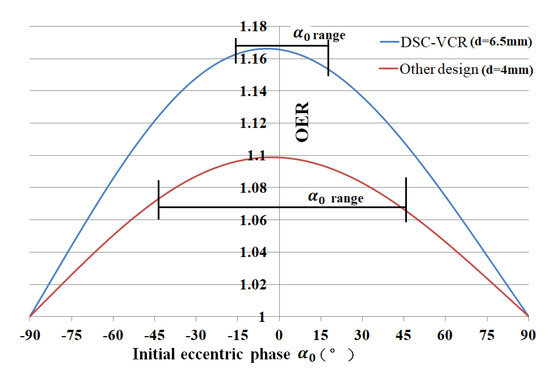 Case 3 was one of the common working conditions of HEVs; therefore, we added another case (other design) with an eccentric size of 4 mm, which is the maximum size among all of the similar mechanisms we could find in reference [23]. To compare with the (DSC-VCR’s) similar mechanism, the advantage of the DSC-VCR could be presented more obviously.