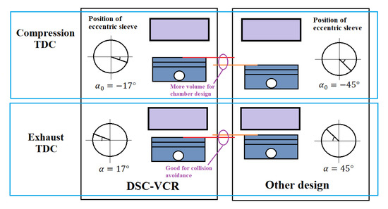Meanwhile, a larger eccentric size is helpful for reducing the adjustment range of the eccentric phase for the same CR range. For example, to change the CR from 10.1 to 17.9, the for other designs needs to vary from −45° to 45° in our conservative estimate [24]. However, for the DSC-VCR, only needs to vary from −17° to 18°. On the one hand, the reduced variation range helps the engine operate with a higher OER under all conditions, as shown in Figure 4; on the other hand, the reduced results in a reduced height difference between the compression TDC and the exhaust TDC under a full load condition. Hence, for the DSC-VCR, the clearance between the piston and the cylinder head at the compression TDC is much less, as shown in Figure 5, and more volume belongs to the chamber. Therefore, it is much easier to design the combustion chamber shape, and at the exhaust TDC, the clearance between the piston and the cylinder head for the DSC-VCR is larger, which is helpful for the avoidance of valve collision.