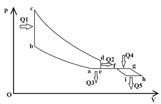 The theoretical cycle of the DSC-VCR is shown in Figure 6 below. In Figure 6, the cycle a–b–c–d–e is the process in the cylinder that refers to adiabatic compression, constant volume heating, adiabatic expansion, and constant volume releasing in sequence. Q1 refers to the heat of the constant volume heating, and Q2 refers to the heat of the constant volume releasing. The cycle f–g–h–i is the process in the turbocharger that refers to constant pressure heating, adiabatic expansion, constant pressure releasing, and adiabatic compression in sequence. Q4 refers to the heat of the constant pressure heating, and Q5 refers to the heat of the constant pressure releasing. F–a is the process in the inter-cooler, and Q3 refers to the heat of the gas temperature decrease.