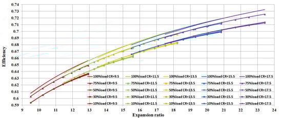 The theoretical thermal efficiency of the DSC-VCR with variations of the ER under different engine loads and CRs is shown in Figure 8. In the case of a constant CR for each curve, the theoretical efficiency of the engine is significantly improved with the increase of . For the CR of 9.5, the efficiency can be improved by 0.0035–0.006 per millimeter increase of . For a CR of 17.5, the efficiency can be improved by 0.0025–0.004 per millimeter increase of . For the 100% and 75% loads in the absence of knock, the efficiency is higher because of the turbocharger. For the conditions without boosting, the efficiency is only influenced by for different load conditions. Therefore, to further improve engine efficiency, increasing the engine load and the CR with knock avoidance and by using a larger to increase the ER is quite an effective measure.