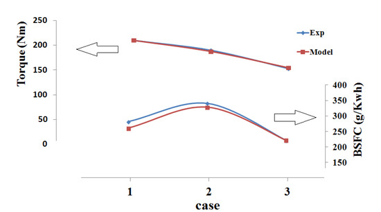 The combustion process is described by fractal model. For the heat transfer, the Hohenberg model is used [28]. We simulated three cases under high load conditions, including the maximum torque case with 1750 rpm (case 1), the maximum power case with 5500 rpm (case 2), and the high efficiency case with 2300 rpm and a 75% load (case 3). According to the experimental data, the torque and brake specific fuel consumption (BSFC) were validated as below in Figure 9. The highest octane number (ON) of the base engine in case 1 was 111.7. Thus, 112 was considered as the knock limit number.
