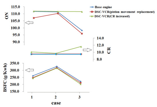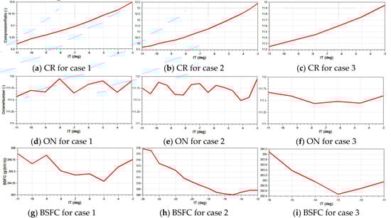 Step 2: The rate of heat release for the DSC-VCR must be different due to the variation of residual gas fraction, the CR, and turbulence. Therefore, the ignition timing (IT) must be optimized. By monitoring the ON and not allowing it to exceed 112, we can avoid knock while adjusting the IT and the CR. The details of the optimization are shown in Figure 11. For cases 1 and 3, we chose the IT and the CR with the lowest BSFC. For case 2, with further consideration of nitrogen oxide (NOX) generation and exhaust temperature, the IT of −17 deg was chosen.