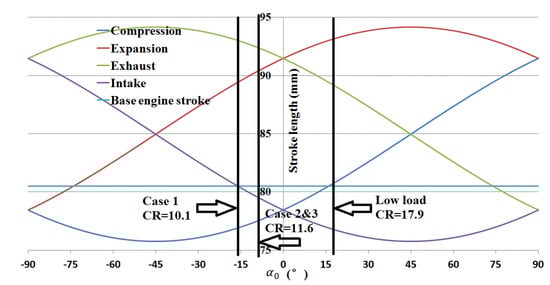 During steps 1 and 2, the way to adjust the CR for the DSC-VCR is to change by rotating the eccentric sleeve. Meanwhile, the stroke length is different, which is shown in Figure 12 below. For the CR adjustment range from 10.1 to 17.9, needs to vary from −16° to 17°. In case 1, the engine was under the full load, and with the increased crank radius of 42.48 mm, the intake stroke of the DSC-VCR was the same as that of the base engine. For other cases, the engine load was lighter, so the intake stroke was shorter, which realized auto-downsizing.