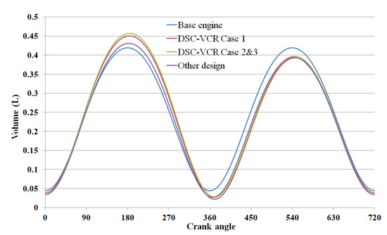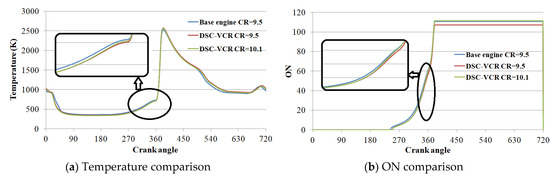 As shown in Figure 13, for the DSC-VCR, the volume at the exhaust TDC was smaller than that at the compression TDC, which means that the piston rose higher at the exhaust TDC to push residual gas out of the cylinder. In case 1, the percentage of residual gas of the base engine was 5.63%, but for the DSC-VCR without an increased CR (the red one in Figure 10), the residual gas percentage was 2.62%. Hence, the mean mixture temperature of the DSC-VCR was about 25 K lower than that of the base engine during the intake and compression stroke, as shown in Figure 16. Therefore, the calculated ON was lower than that of the base engine, and the CR could be increased through step 1.