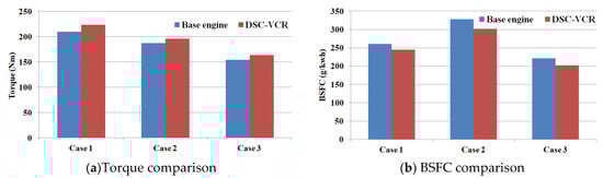Comparison of torque and the BSFC for the base engine and the DSC-VCR.