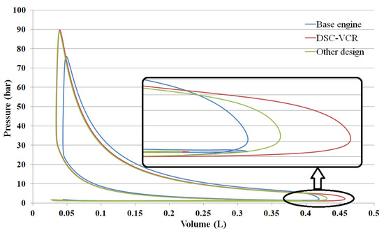 The overexpansion of the DSC-VCR can be regarded as another way to make use of the exhaust energy. Compared with turbocharging, which also recycles exhaust energy, the energy utilized by overexpansion is on a higher grade. Therefore, the entropy increase in the cycle is smaller, and the thermal efficiency is higher. Compared with the Miller cycle, of which expansion ratio also larger than the CR, overexpansion does not cause the problem of intake mass reduction. Furthermore, overexpansion can be combined with turbocharging and the Miller cycle to further improve engine efficiency. The pressure-volume (P–V) diagram in Figure 17 shows that, in case 3, the DSC-VCR gained more power output than the base engine with the same boost pressure. For the other design, the effect of overexpansion is less obvious. Another advantage of overexpansion is the temperature decrease of exhaust gas, which helps to avoid the enrichment of mixture, as presented in step 3 above.