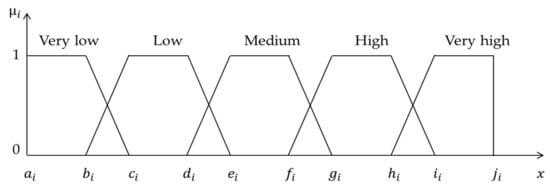 Representation of the variables through five fuzzy sets and their membership functions, where , corresponds to the membership function for fuzzy sets very low, low, medium, high, and very high; , , , , , , , , , and are the vertices of the fuzzy sets; and is the value of each variable (substrate ratio, acidification, chemical oxygen demand, pH, and temperature), whose domain was defined according to the database. In the response variables, the domain was defined according to the results achieved during the tests.