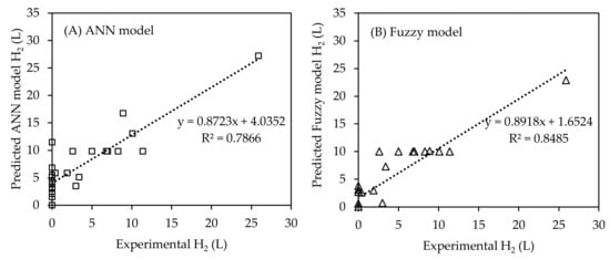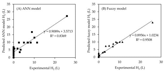 Correlation between the experimental and predicted training hydrogen production data used in (A) the ANN model and (B) fuzzy model.