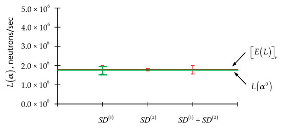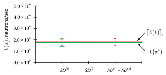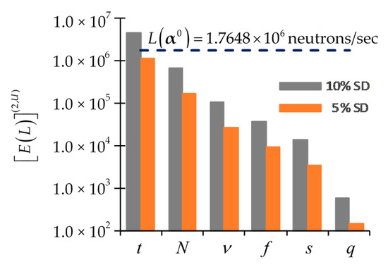 Thus, Figure 8 illustrates the magnitudes of the 2nd-order contributions, , to the expected value, , of the PERP’s leakage response. The 2nd-order contributions, are computed in [1,2,3,4] using expressions similar to Equation (114) and stem from 2nd-order sensitivities of the parameters underlying the total, scattering and fission cross sections, the average number of neutrons per fission, isotopic number densities, and the source parameters, respectively. Since correlations among parameters are unavailable, these parameters are considered to be uncorrelated and having all uniform standard deviations (SD) of either 5% or 10% respectively. A standard deviation of 5% is typical for the available nuclear data while the standard deviation of 10% is used to illustrate how an increase in the parameter uncertainties would affect the expected value of the leakage response. The nominal value, , of the leakage response is also displayed in Figure 8, in order to provide an evident standard for assessing the importance of the 2nd-order contributions to the expected value, , of the PERP’s leakage response. Recall from Equation (113) that if the 2nd-order sensitivities are ignored or are unavailable, the expected value, , will coincide with the nominal value, . The comparison presented in Figure 8 indicates that, assuming a uniform standard deviation of either 5% or 10% for all parameters, the magnitudes of the 2nd-order contributions stemming from the various imprecisely known nuclear data fall into the following ranking order (from small to large):
