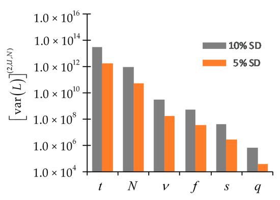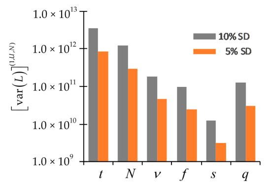 Figure 11 presents a comparison of contributions to the skewness, , computed using expressions similar to Equation (119), of the PERP leakage response to the PERP parameters (considered to be uncorrelated and normally distributed) underlying the total, scattering and fission cross sections, the average number of neutrons per fission, isotopic number densities, and the source parameters, as presented in [1,2,3,4], respectively. The comparison presented in Figure 11 indicates that, assuming a uniform standard deviation of either 5% or 10% for all parameters, the magnitudes of the 2nd-order contributions stemming from the various imprecisely known nuclear data fall into the following ranking order (from small to large):