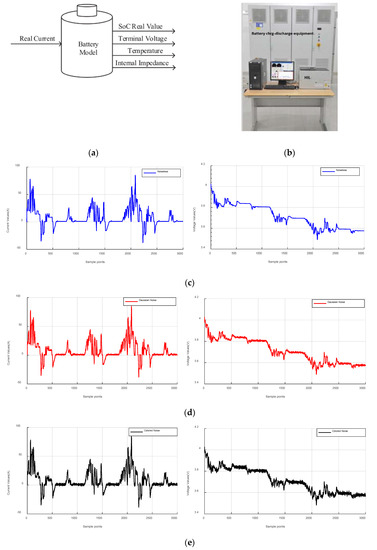 Figure 5. The test platform and data. (a) Battery Model in HIL, (b) Test platform. (c) Current values and terminal voltage values under NEDC condition without noise. (d) Current values and terminal voltage values under NEDC conditions with Gaussian noise. (e) Current values and terminal voltage values under NEDC conditions with Color noise. (f) Measured value. - The second part: “The verification and comparison of the parameter SLUKF algorithm effectiveness by a test platform with battery charging and discharging equipment (shown in Figure 5b)”.During this verification process, we use a real LG18650 battery to perform tests to make it discharge according to the discharge current of the actual NEDC operating conditions (shown in Figure 5c), and collect its measured value (shown in Figure 5f) and terminal voltage (shown in Figure 5c) as the true value to analyze and compare the performance of the parameters of the self-learning UKF algorithm proposed in this article. Also, in this part of the verification process, in order to be more realistic and close to the actual situation, we add Gaussian white noise and colored noise signals to the current under NEDC operating conditions and the collected terminal voltage to generate noise-containing current and voltage signals (shown in Figure 5d,e).