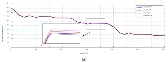 The estimation results are shown in Figure 8. It can be expected that we can find that the MaxE of the LGA_PSO_SLUKF SoC estimator is about 0.5%. However, the maximum MaxE of the LGA_PSO_UKF SoC estimator and the maximum error of the LGA_PSO_PF SoC estimator are approximately 1.1% and 0.8%, respectively. This is because it is difficult for the traditional UKF to give the optimal position of the Sigma points when the system is disturbed, while the SLUKF algorithm can still achieve the optimal position of the Sigma points by optimization. Therefore, even in a noisy environment, the SLUKF algorithm still has good accuracy. In addition, because the number of particles in the PF algorithm is larger than the number of Sigma points in the traditional UKF algorithm, the tracking state variance is better, so its accuracy is relatively high. But, this accuracy comes at the expense of computational complexity.
