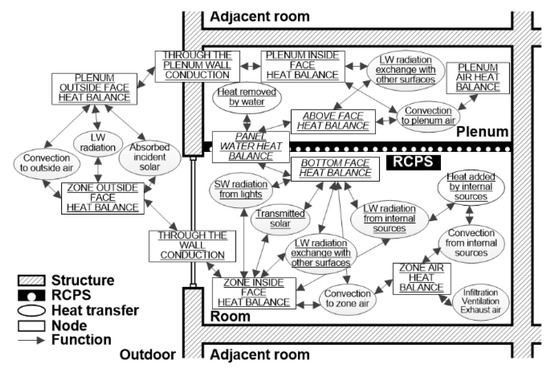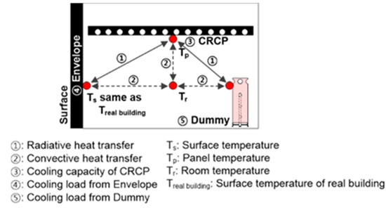 In order to establish the boundary condition for evaluating the cooling capacity of the CRCP, the influencing factors affecting the boundary conditions must be analyzed. In this study, the heat transfer process in the plenum and the room is analyzed by establishing the heat transfer model of the test room where the CRCP is installed based on the heat transfer model of ASHRAE (schematic of heat balance processes in zone) to figure out the influencing factors [15]. The heat transfer model in the space with the CRCP based on the ASHRAE model, consists of three parts: a plenum, a ceiling with a panel, and a room. In the actual building, the heat transfer occurs as shown in Figure 3. In the test room, convective heat transfer occurs between the room air and the bottom face of the ceiling, while radiative heat transfer occurs between the zone inside face and the bottom face of the ceiling. Finally, Figure 4 shows the simplified heat transfer model of the test room equipped with the CRCP.
