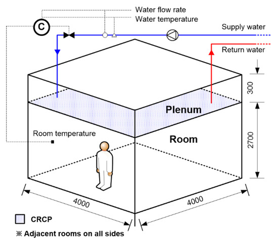 The simulation model for evaluating boundary conditions was implemented with the aim of obtaining the boundary condition when the CRCP is in operation under the various influencing factors. EnergyPlus V8-1-0 and LabVIEW were used for simulation. EnergyPlus is suited for radiation and convection heat transfer on the surface, since a heat balance-based solution is possible [19]. The boundary condition based on the varying factors can be used as the output data. In addition, the iterative calculation processes to find the supply water mentioned in step 5 of Section 4.1 were performed by linking LabVIEW and EnergyPlus. The size of the space is 4.0 m (width) × 4.0 m (depth) × 3.0 m (height), as shown in Figure 5. The CRCP and air conditioning system are installed in each zone. In this study, the CRCP was modeled using a self-developed product. Figure 6 shows the system flow chart of the CRCP installed in the test room.