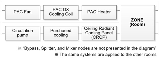 In order to derive the boundary condition based on the influence factor changes, the CRCP installed space was modeled via simulation. Table 8 shows that the boundary condition derivation model is implemented in six steps. In step 1, the simulated input variables were derived from the influencing factor and the range of values or values of each factor. In step 2, the room fitted with CRCP and the adjacent room were modeled as in Figure 5, such that it is possible to set the desired influence factors in the space to be analyzed. In step 3, a CRCP and an air conditioning system were modeled in the main room and the adjacent room to derive the thermal load. Specifically, the air conditioning system was operated while the CRCP remained off, and the thermal load removed by the air conditioning system was estimated. The cooling capacity of the CRCP necessary to maintain the set temperature can be estimated. In steps 4 and 5, the process of finding the correct supply water temperature to satisfy the set room temperature, was reiterated by simulation using a fixed flow rate. In step 6, the boundary condition of the test room where the CRCP is installed was finally derived when the CRCP was in operation.