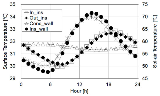 However, in the unsteady-state where the sol-air temperature changes in the daytime, the indoor surface temperature of the surface exposed to the outside air also changes due to the heat storage. Figure 7 shows that the surface temperature of the lightweight wall is similar to the profile of the sol-air temperature, unlike in heavy wall. Since the outside insulated wall is influenced more by the heat storage, the change in the surface temperature of the indoor surface is smaller than that of the inside insulated wall.