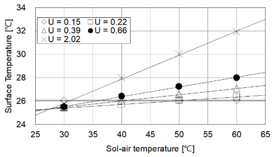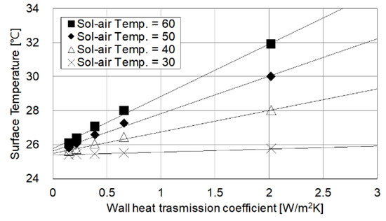 In the wall with the same thermal conductivity, the inner surface temperature of the exposed surface is higher, since the sol-air temperature is higher (Table 12). As the sol-air temperature rises from 30 to 60 °C in the wall with 2.02 W/m2K, the indoor surface temperature of the exposed surface also rises from 25.7 to 31.9 °C Conversely, when the heat transmission coefficient of the wall is as low as the level of the passive house, the sol-air temperature has little effect on the surface temperature (Figure 11).