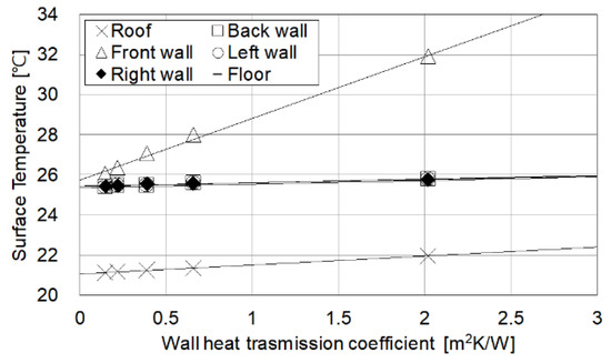 The surface temperature of the wall exposed to the outside air is decreased from 31.9 to 26.1 °C when the heat transmission coefficient of the wall changes from 2.02 to 0.15 W/m2K when the sol-air temperature is 60 °C (Figure 8). This tendency is as a result of heat transmission coefficient being the determinant factor in the surface temperature of the wall in steady state conditions. When the sol-air temperature is 30 °C the ambient temperature is not affected by the outside air, regardless of the heat transmission coefficient. Figure 9 shows that for the wall that is not exposed to the outside air, with exception of the front wall, the sol-air temperature has almost no influence.