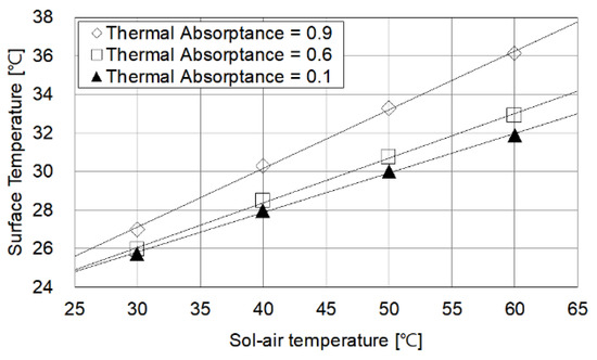 The higher the surface absorption rate of the wall, the more the boundary conditions are affected by the outside air. When the sol-air temperature is less than 30 °C there is hardly any influence by the outside air, regardless of the surface heat absorption rate of the wall. However, as the ambient temperature increases, the influence of the surface heat absorption rate also increases.
