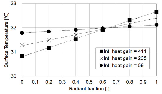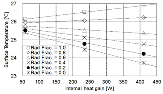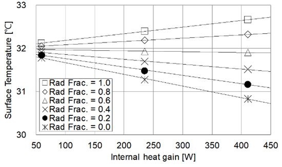 As the internal heat gain increases, there is a corresponding surface temperature change (Figure 12). In particular, when the internal heat gain is 411 W, the surface temperature change is 1.8 °C as the radiation component of the internal heat gain changes from 0 to 1. However, when the internal heat gain is as small as 59 W, the surface temperature change due to the radiation component is within a maximum of 0.5. When the radiative component of the internal heat gain is between 0.6 and 0.7, it shows a constant surface temperature, regardless of the internal heat gain.