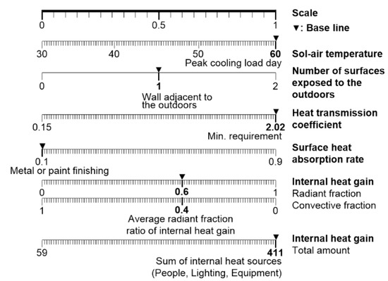 The values and ranges of these factors affect every heat transfer process and are derived as shown in Table 5 based on previous research and international standard analysis [3,4,7]. The sol-air temperature of Group 1 is the ambient temperature of the building located at 36 degrees north latitude. The wall heat transmission coefficient of 2.02 W/m2K is the minimum design requirement for the wall heat transfer rate and 0.15 W/m2K is the insulation standard for passive houses. Table 5 is the reference for setting the values, ranges, and values of each factor.