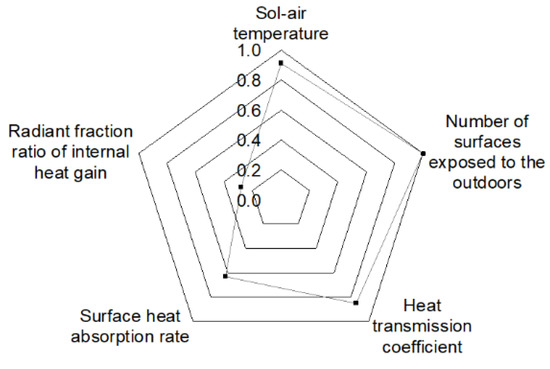Figure 16 shows that the factors that have the greatest influence on the boundary condition of the CRCP installed space is the number of the surfaces exposed to the outdoor environment. When the number of surfaces exposed to the outside air rises from 0 to 2, there is significant increase in the surface temperature. Thus, the factor ‘number of surfaces exposed to the outdoors’ is assigned (1.0) as the reference of impact. Subsequently, the influences are significant in the following order: ‘sol-air temperature’ (impact 0.91), ‘heat transmission coefficient’ (impact 0.85), ‘surface heat absorption rate’ (impact 0.63), and ‘component of internal heat gain’ (impact 0.28). Since the influence of the surface temperature on the factors related to the site and building belonging to Group 1 is high, when evaluating the cooling capacity of the CRCP, the surface temperature should be set based on the adjacent space and the outside air temperature. The influencing factors, which are in Group 2, are less influential compared to Group 1. The internal heat gain factors of Group 3 have relatively little effects on the surface temperature. In a room with more than one surface exposed to the outside air, the thermal load caused by the external load is dominant, compared to the other factors.