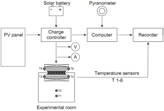 Within each particular stage, three measuring series were conducted. The unchanged laboratory set consisting of an experimental room and the same type of TE module was used in the presented laboratory measurements. Depending on the stage, the applied heat exchangers and measuring equipment were changed. The first stage aimed at the determination of the power supply parameters for the in-situ operation of the PV panel and measurement of the temperature characteristics of the TE module operating with the air finned heat sink, with heat dissipation to the surrounding. The second stage was performed under laboratory conditions, imitating the PV power supply parameters for the TE module operating in the cooling mode, with heat recovery via water exchanger. An additional third stage aimed at the characterization of the design, in which all the energy is provided by a solar battery charged by a PV panel (discharging).