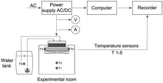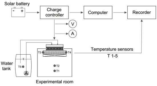 At the next two stages of the experiment (Stages 2 and 3), two different types of heat exchangers were adjusted to the applied TE module. On the cold side of module, facing the room interior, the Alpine 11 Plus set was used, while on the hot side of the module the water heat exchanger was installed. The water exchanger consisted of Pacific W1 CPU water block (Thermaltake Technology Co., Ltd., Taipei, Taiwan) attached to the TE module, insulated water tank with a maximum volume of 10 dm3, insulated PVC elastic pipes of 12 × 2 mm and universal New Jet NJ 600 submersible water pump (Newa Tecno Industria SRL, Loreggia, Italy) placed inside the tank. Standard fittings were used to connect all elements of water exchanger. The distilled water was used as cooling liquid during the experiment. At the Stage 2, the TE module, fan and water pump were powered by a laboratory power supply. The scheme of the experimental set tested during Stage 2 is presented in Figure 2. At Stage 3, the TE module was powered by a solar battery through the charge controller. Fan and water pump were powered by a laboratory DC power supply. The scheme of the experimental set tested at Stage 3 is shown in Figure 3.