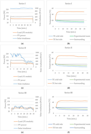 According to the presented results of measurements, the efficiency of the PV panel was quite low, so that the supply parameters were not constantly enough for the TE module supply, depending on the actual solar irradiance. In the first and second series (Figure 4a,c), the output power covered TE module consumption and was used to charge the solar battery, except for temporary cloudiness causing a decrease in power after 24 min of Series II.
