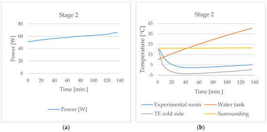 The measurements conducted at all series in Stage 2 lasted until the water temperature inside the tank equaled 40 °C which was achieved after 136 min of experiment, considering the mean results. After that time, the air inside the experimental room was cooled by 14.7 °C. The minimum temperature values noted during the experiment at the heat sink, installed on the cold side of TE module, equaled –3.8 °C. The results of the experiment are presented in Figure 5b.