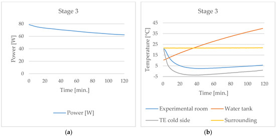 During the experiments, the TE module current parameters, i.e. amperage and voltage, were monitored. These parameters were used to determine the values of power applied to the TE module (Figure 6a). It was noted that during the conducted measuring series at Stage 3, the values of applied current were decreasing, which was connected with battery discharging.