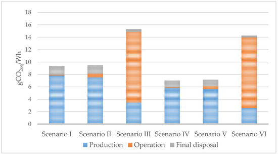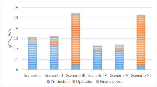 The last part of research was intended to calculate the indicators evaluating the environmental impact of energy unit, generated by the examined system powered by a PV panel, battery and compared to the grid supply option. The material and energy balance was completed on the basis of measurements, calculations and producer data. For life cycle modelling and calculation of indicators, SimaPro v 8.1 (PreConsultants, Amersfoort, The Netherlands) with the Ecoinvent database [31] was used. A model of the system’s life cycle included the production of elements of system, predicted servicing, energy performance and final disposal. Considered scenarios in the LCA included: