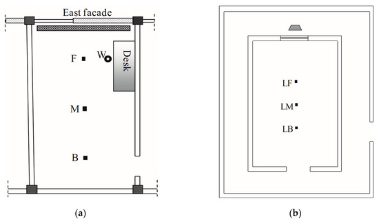 Schema of the analyzed office (a); schema of the laboratory test room (b).
