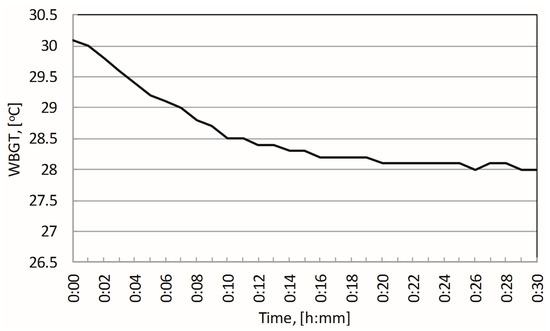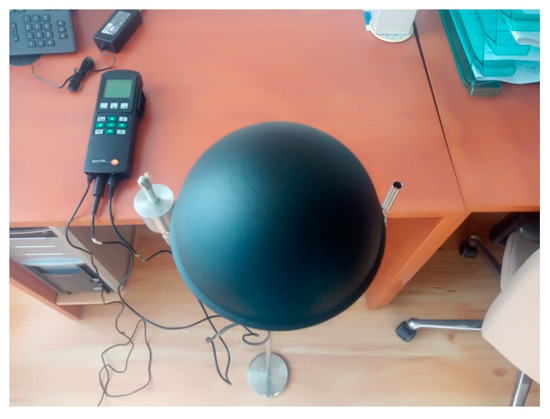 According to ISO 7243, the Standard the maximum value of WBGT should be 30 °C for persons acclimatized to heat, if the metabolic rate is 65 W/m2 < M < 130 W/m2. In the case of persons not acclimatized to heat, the WBGT should be lower than 29 °C. There are different possibilities to determine the WBGT index [28,29]. In our case, the WBGT index was measured according to ISO 7243 with the TESTO 400 instrument (Figure 2).
