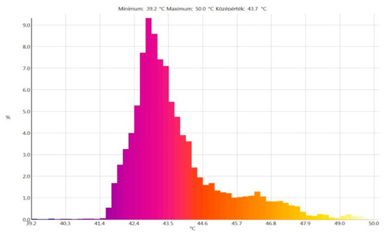 It can be observed that quite high temperatures occur because of the direct solar radiation. The absorbed energy leads to the increase of the wired glass temperature, so this surface became a radiant heating surface during the day. The histogram of the temperature values obtained with IRSoft 4.3 software is presented in Figure 4. The minimum surface temperature value on the analyzed building element was 39.2 °C, while the maximum value was 50 °C. The mean surface temperature value of the wall was 43.7 °C.