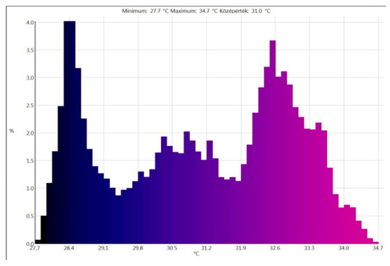 The histogram of the window + wooden frame surface temperatures are illustrated in Figure 6. The minimum surface temperature value of the analyzed area was 27.7 °C, while the maximum value was 34.7 °C. The mean surface temperature of the double glazed window was 31 °C.