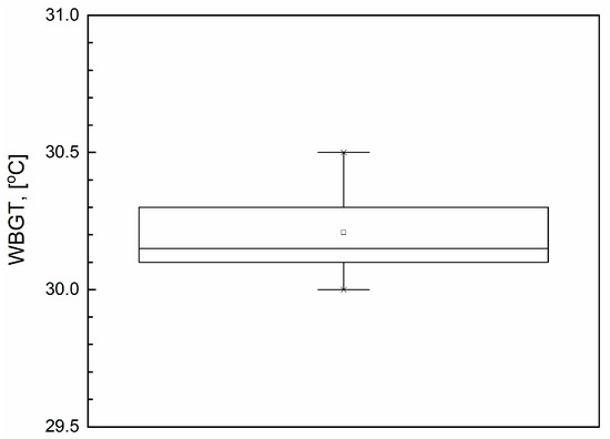 With such high temperatures, the WBGT index was measured with the TESTO 400 instrument (point W in Figure 1a). The box chart of the registered values (between 9:30–10:00) is presented in Figure 7.