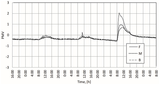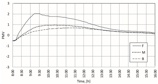 With such high temperatures, it is obvious that, on sunny days in this room, thermal comfort problems will occur. Using the TESTO 480 instrument, the PMV was measured (F, M, B measuring points in Figure 1a). Spanning three consecutive days (December, 2019), the registered PMV is shown in Figure 8. As it can be observed, the first two days were cloudy days, but on the third day, the direct solar radiation produced a substantial increase of the PMV.
