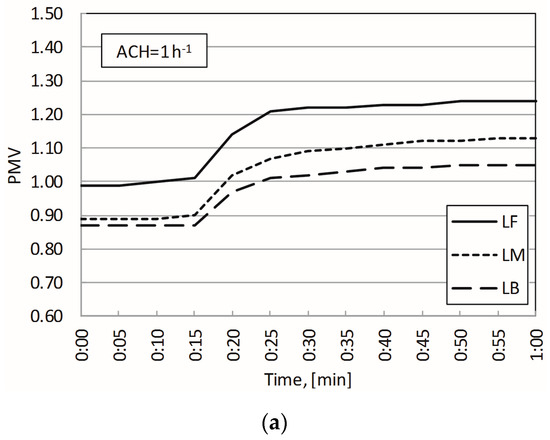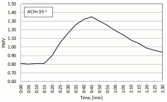 In the Indoor Environment Quality (IEQ) laboratory of the University of Debrecen, a series of measurements were performed in order to quantify the effects of asymmetric radiation on the thermal comfort in three different points of the test room (LF, LM and LB according to Figure 2). The aim was to obtain similar temperatures as those registered in the office. The radiation through the window of the test room was obtained using a 1000 W metal halide lamp. Measurements were carried out for 0.5 h−1, 1.0 h−1, 1.5 h−1, 2.0 h−1, 2.5 h−1 and 3 h−1 air change rates (ACH) assuming that the higher air change rate will reduce the effects of the asymmetric radiation. In the test room, 28 °C was provided using radiator (placed under the window), walls, floor and ceiling heating. Each measurement was one hour long, and for the first 15 min, the window was covered on the outer side with chipboard in order to keep out the lamp radiation. After 15 min, the chipboard was taken off and the direct radiation entered in the test room. The measured PMV values at three different air change rates are presented in Figure 9. It can be observed that the highest PMV values were registered in LF measuring point (being the closest point to the window). Furthermore, the higher the air change rate was, the higher the PMV values were.